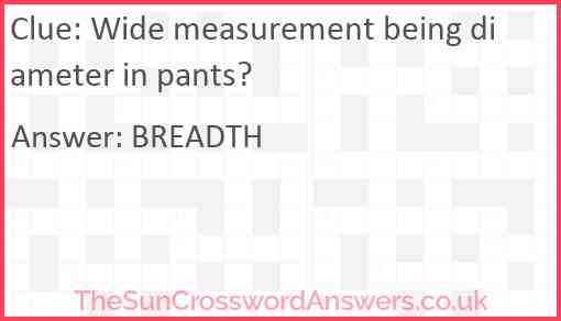 Wide measurement being diameter in pants? is a crossword clue for which we have 1 possible answer and we have spotted 1 times in our database. This crossword clue was last seen on 17 March 2025 in The Sun Cryptic Crossword puzzle!