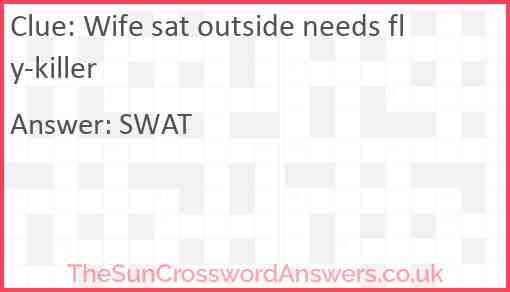 Wife sat outside needs fly-killer is a crossword clue for which we have 1 possible answer and we have spotted 1 times in our database. This crossword clue was last seen on 21 October 2024 in The Sun Cryptic Crossword puzzle!