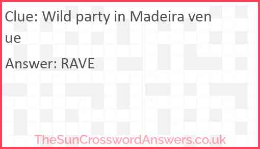 Wild party in Madeira venue is a crossword clue for which we have 1 possible answer and we have spotted 3 times in our database. This crossword clue was last seen on 12 October 2024 in The Sun Cryptic Crossword puzzle!