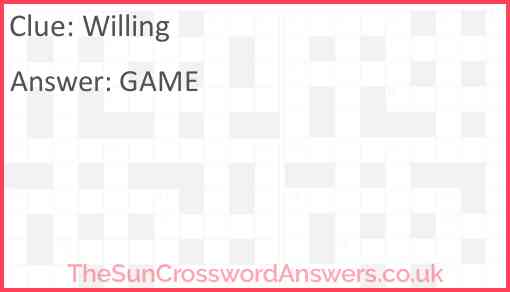 Willing is a crossword clue for which we have 1 possible answer and we have spotted 6 times in our database. This crossword clue was last seen on 10 April 2024 in The Sun Coffee Time Crossword puzzle!