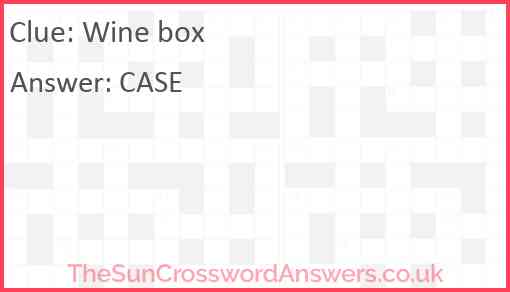 Wine box is a crossword clue for which we have 1 possible answer and we have spotted 1 times in our database. This crossword clue was last seen on 11 August 2024 in The Sun Coffee Time Crossword puzzle!
