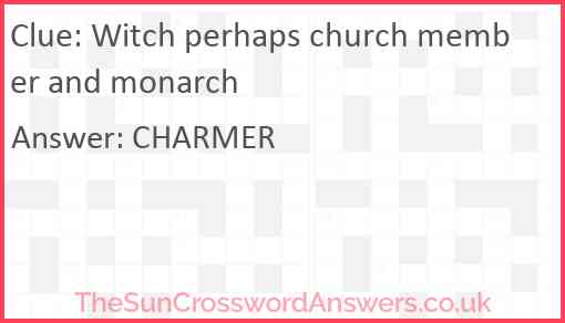 Witch perhaps church member and monarch is a crossword clue for which we have 1 possible answer and we have spotted 1 times in our database. This crossword clue was last seen on 21 December 2020 in The Sun Cryptic Crossword puzzle!