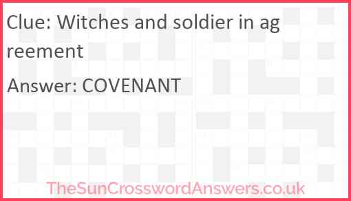Witches and soldier in agreement is a crossword clue for which we have 1 possible answer and we have spotted 2 times in our database. This crossword clue was last seen on 09 August 2023 in The Sun Cryptic Crossword puzzle!