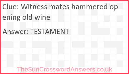 Witness mates hammered opening old wine is a crossword clue for which we have 1 possible answer and we have spotted 1 times in our database. This crossword clue was last seen on 18 September 2024 in The Sun Cryptic Crossword puzzle!