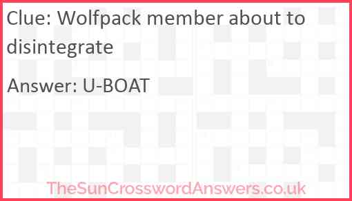 Wolfpack member about to disintegrate is a crossword clue for which we have 2 possible answer and we have spotted 3 times in our database. This crossword clue was last seen on 30 December 2023 in The Sun Cryptic Crossword puzzle!