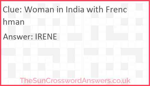 Woman in India with Frenchman is a crossword clue for which we have 1 possible answer and we have spotted 3 times in our database. This crossword clue was last seen on 01 August 2023 in The Sun Cryptic Crossword puzzle!