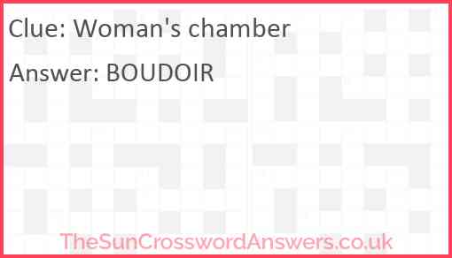 Woman's chamber is a crossword clue for which we have 1 possible answer and we have spotted 1 times in our database. This crossword clue was last seen on 09 April 2025 in The Sun Coffee Time Crossword puzzle!