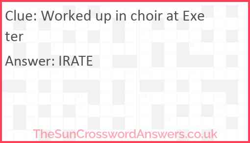 Worked up in choir at Exeter is a crossword clue for which we have 1 possible answer and we have spotted 3 times in our database. This crossword clue was last seen on 12 August 2023 in The Sun Cryptic Crossword puzzle!
