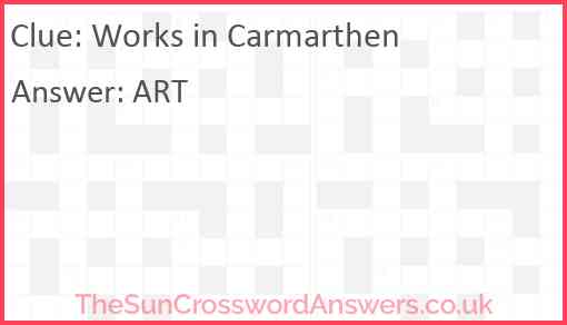 Works in Carmarthen is a crossword clue for which we have 1 possible answer and we have spotted 3 times in our database. This crossword clue was last seen on 17 August 2024 in The Sun Cryptic Crossword puzzle!