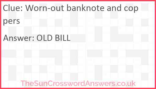 Worn-out banknote and coppers is a crossword clue for which we have 2 possible answer and we have spotted 2 times in our database. This crossword clue was last seen on 20 November 2023 in The Sun Cryptic Crossword puzzle!