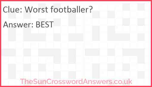 Worst footballer? is a crossword clue for which we have 1 possible answer and we have spotted 1 times in our database. This crossword clue was last seen on 09 December 2024 in The Sun Cryptic Crossword puzzle!