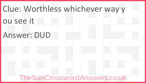 Worthless whichever way you see it is a crossword clue for which we have 1 possible answer and we have spotted 2 times in our database. This crossword clue was last seen on 25 March 2022 in The Sun Cryptic Crossword puzzle!