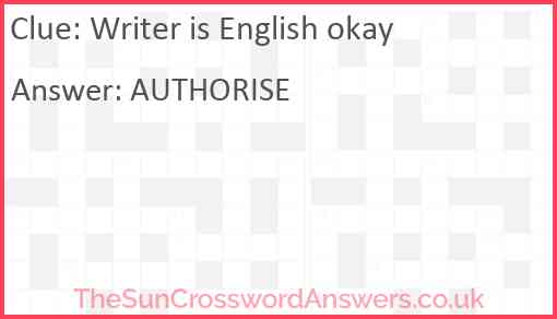 Writer is English okay is a crossword clue for which we have 1 possible answer and we have spotted 1 times in our database. This crossword clue was last seen on 03 October 2019 in The Sun Cryptic Crossword puzzle!