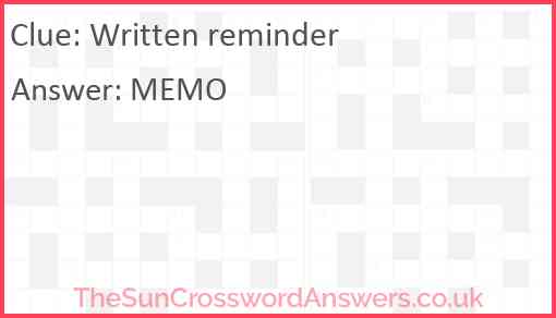 Written reminder is a crossword clue for which we have 1 possible answer and we have spotted 4 times in our database. This crossword clue was last seen on 31 December 2023 in The Sun Coffee Time Crossword puzzle!