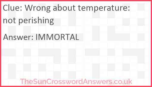 Wrong about temperature: not perishing is a crossword clue for which we have 1 possible answer and we have spotted 1 times in our database. This crossword clue was last seen on 10 December 2024 in The Sun Cryptic Crossword puzzle!