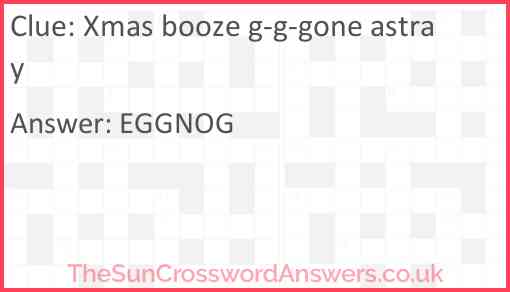 Xmas booze g-g-gone astray is a crossword clue for which we have 1 possible answer and we have spotted 3 times in our database. This crossword clue was last seen on 17 March 2024 in The Sun Cryptic Crossword puzzle!