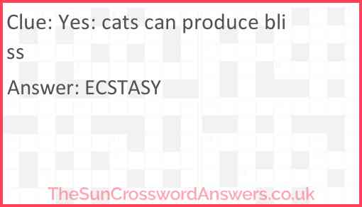 Yes: cats can produce bliss is a crossword clue for which we have 1 possible answer and we have spotted 3 times in our database. This crossword clue was last seen on 01 February 2025 in The Sun Cryptic Crossword puzzle!