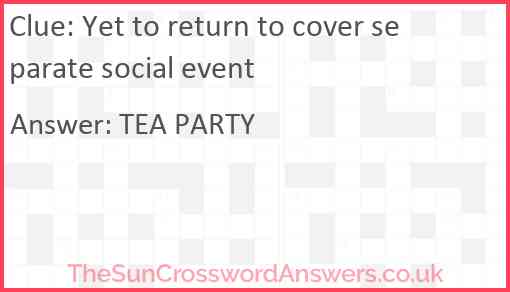 Yet to return to cover separate social event is a crossword clue for which we have 2 possible answer and we have spotted 2 times in our database. This crossword clue was last seen on 21 March 2023 in The Sun Cryptic Crossword puzzle!