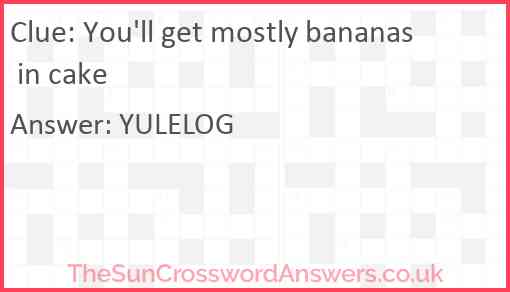 You'll get mostly bananas in cake is a crossword clue for which we have 1 possible answer and we have spotted 1 times in our database. This crossword clue was last seen on 15 August 2023 in The Sun Cryptic Crossword puzzle!