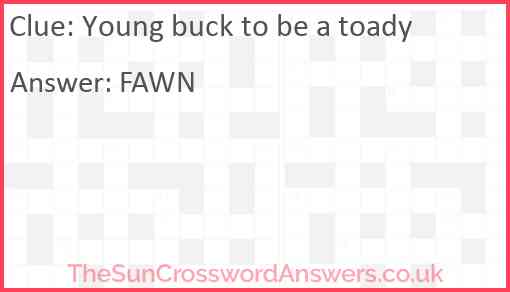 Young buck to be a toady is a crossword clue for which we have 1 possible answer and we have spotted 2 times in our database. This crossword clue was last seen on 23 March 2025 in The Sun Cryptic Crossword puzzle!