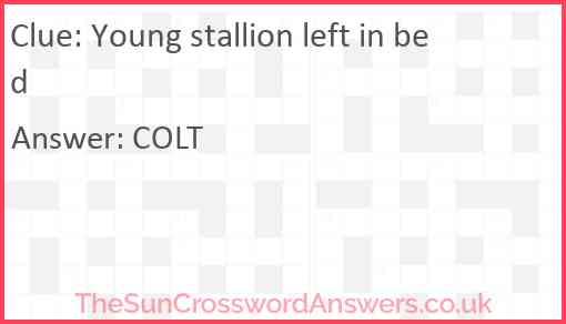 Young stallion left in bed is a crossword clue for which we have 1 possible answer and we have spotted 1 times in our database. This crossword clue was last seen on 08 April 2019 in The Sun Cryptic Crossword puzzle!