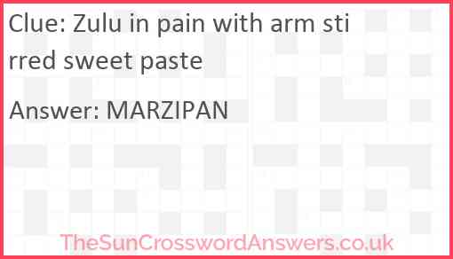Zulu in pain with arm stirred sweet paste is a crossword clue for which we have 1 possible answer and we have spotted 2 times in our database. This crossword clue was last seen on 17 September 2024 in The Sun Cryptic Crossword puzzle!
